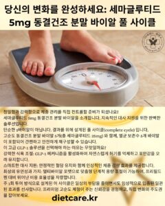 당신의 변화를 완성하세요: 세마글루티드 5mg 동결건조 분말 바이알 풀 사이클 -/1 by dietcarekorea Published: March 31, 2026 (2 days ago) Category Health and Beauty Link 세마글루티드 5mg 동결건조 분말 바이알 정밀함과 강력함으로 체중 관리를 직접 컨트롤할 준비가 되셨나요? 세마글루티드 5mg 동결건조 분말 바이알을 소개합니다. 지속적인 대사 지원을 위한 완벽한 솔루션입니다. 단순한 1바이알이 아닙니다. 결과를 위해 설계된 풀 사이클(complete cycle) 입니다. 고순도 동결건조 분말 바이알 5개(총 세마글루티드 25mg) 와 함께, 멸균 보존수 5개 바이알이 포함되어 간편하고 안전하게 재구성할 수 있습니다.