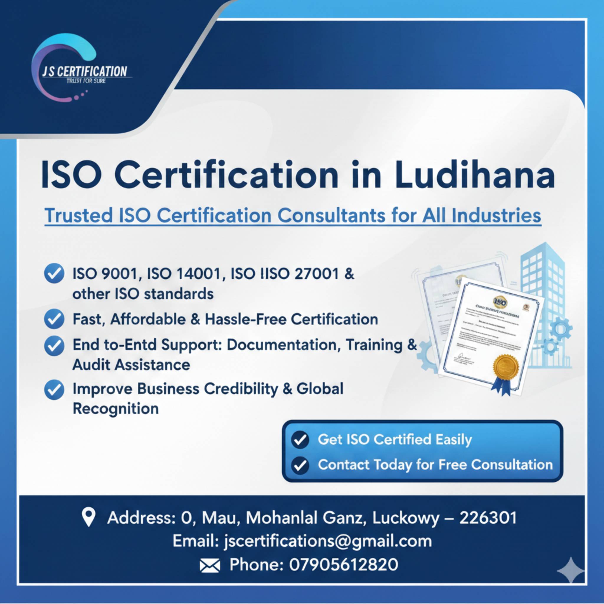 JS Certification provides professional ISO certification services in Ludhiana, helping businesses become compliant with international standards. We offer end-to-end guidance for ISO 9001, ISO 14001, ISO 45001, and other standards, with a fast process, affordable cost, and expert support to help your business achieve credibility and sustainable growth.