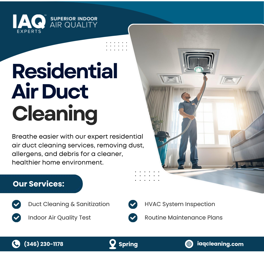 Allergy flare-ups, uneven airflow, and lingering dust often come from dirty ductwork. IAQ Experts offers professional residential air duct cleaning services in Spring, removing pollen, pet dander, and trapped debris from vents. Clean ducts improve breathing, indoor comfort, and HVAC efficiency. Book your residential spring duct cleaning today.