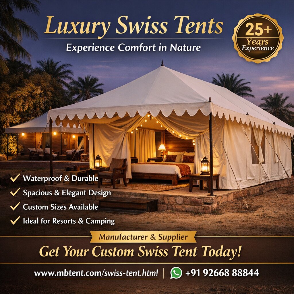 In Delhi, there is a special company that makes Swiss tents. These tents are known for their high quality and unique design. They are perfect for camping, outdoor events, or even luxury stays in nature. The Swiss tent manufacturer focuses on using strong materials to make sure the tents can handle different weather conditions, whether it’s rain, wind, or sun. This means that when people use these tents, they can feel safe and comfortable no matter where they are. The tents come in various sizes and styles, making them suitable for many different activities. Some are big enough to fit families or groups of friends, while others are smaller for individuals or couples. Many people love using these tents for festivals, weddings, or even just a fun weekend getaway in the mountains. The manufacturer also pays attention to details, like how easy it is to set up and take down the tents. This makes it simple for anyone to use them, even if they are not experienced campers.