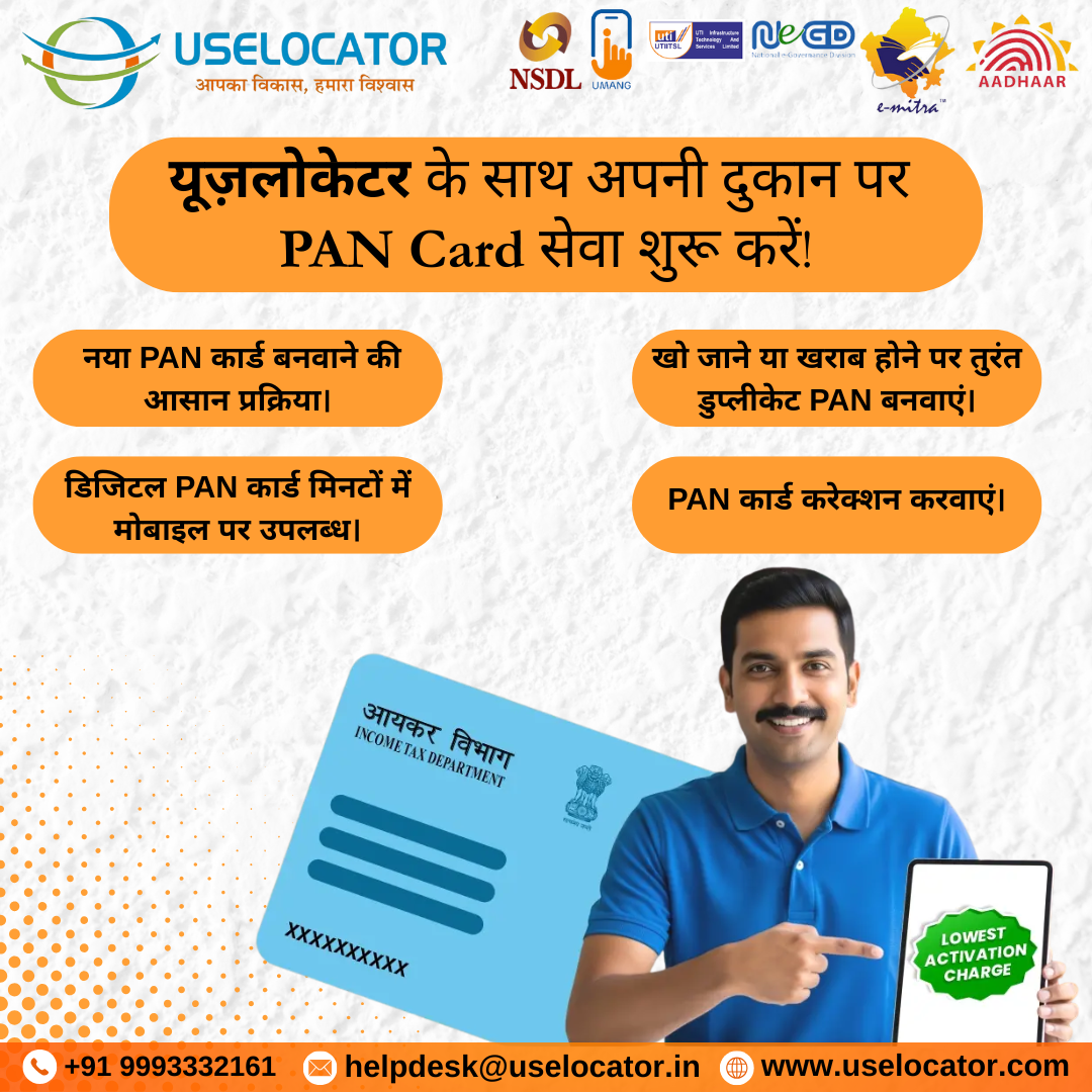 Get easy and secure PAN Card services with Uselocator. Apply for a new PAN Card, get a duplicate for lost or damaged cards, download digital e-PAN instantly, or make corrections to your existing PAN details. Avail these services from your shop or home in just a few minutes.